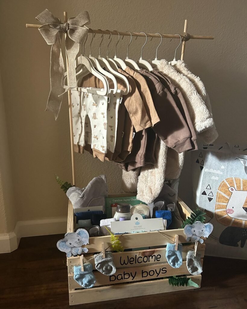 A stylish, rustic wooden crate serves as the base for a mini clothing rack displaying a beautiful collection of neutral-toned, safari-themed garments. The base holds extra blankets and body care products, and the front is decorated with “Welcome baby boys” signage and cute elephant cutouts clipped to a line with tiny socks.