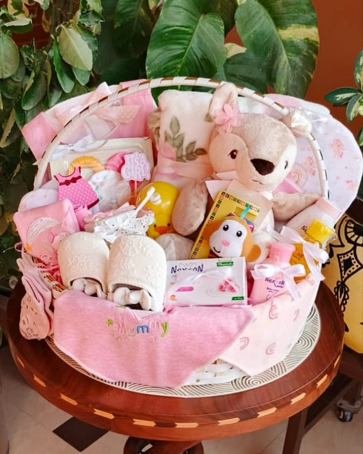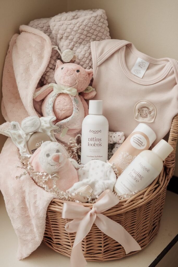 It evokes a mood of delicate sweetness and premium comfort, suggesting a pampered start for the little one. When choosing items, select products with beautiful, cohesive packaging to make the basket feel truly high-end and cohesive.