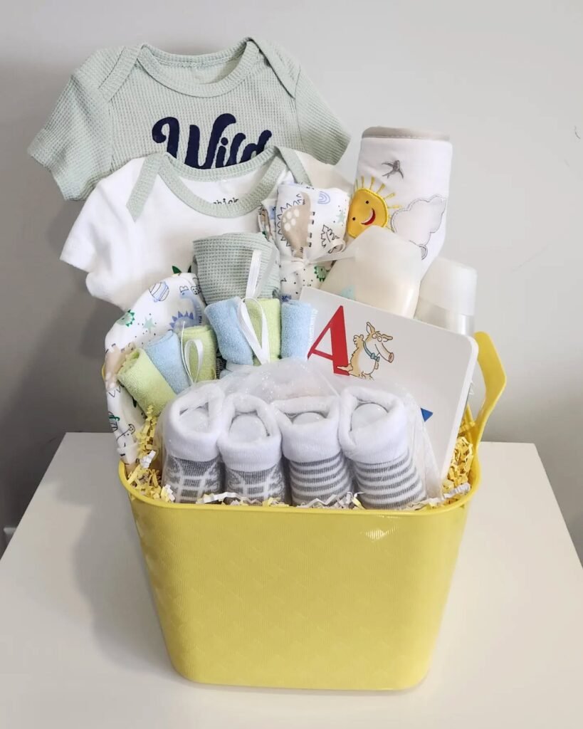Presented in a cheerful, bright yellow plastic tub, this basket is a practical yet sweet collection of necessities for a newborn. It includes several onesies, receiving blankets with gentle sun and animal patterns, baby lotion, a board book, and small, cozy white and gray striped socks tucked neatly in the front.