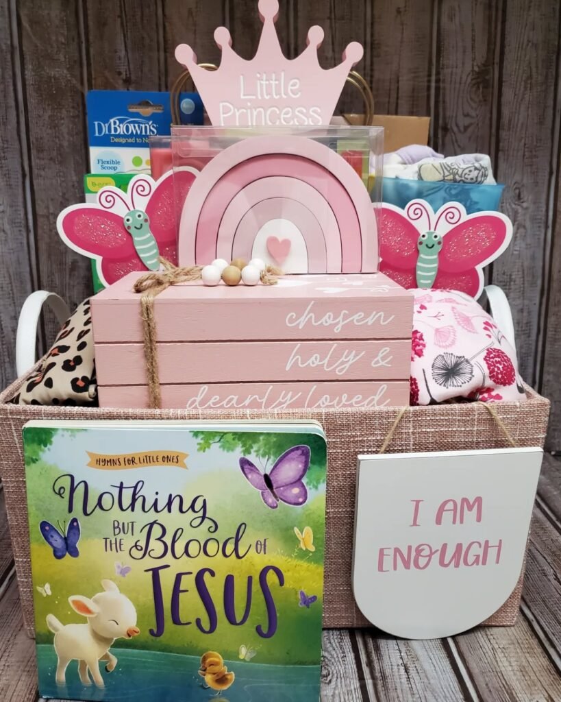 This gorgeously styled pink basket is built around a feminine, faith-based theme, using stacked pink wooden blocks and a sweet rainbow decoration as its central focus. It features a ‘Little Princess’ crown topper, hot pink butterfly cutouts, a Christian-themed book, and a little cloth sign that says, “I AM ENOUGH.”