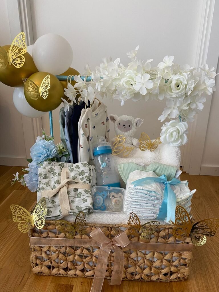 This breathtaking hamper is a masterpiece of soft neutrals and touches of powder blue, featuring a gorgeous tiered display built from a textured, woven base. It’s styled with a mini clothing rack, a stack of diapers secured with a blue ribbon, a bottle, a muslin blanket, and is crowned with white flowers and clusters of gold and white balloons.