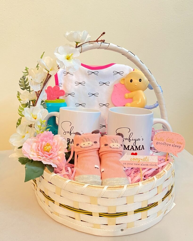 The bright white basket and the gentle pastel contents create a clean, crisp, and feminine presentation. The personalization on the mugs makes it feel incredibly special and considered, moving beyond just baby items.