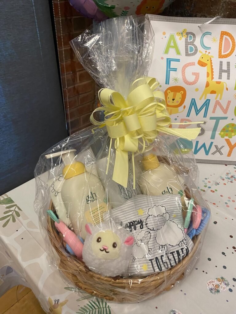 This $\text{baby shower basket}$ is a classic, practical gift, overflowing with essentials and neatly wrapped in clear cellophane with a sunny yellow bow. The contents include baby bath products, a plush sheep toy, a patterned blanket, a brush, and a few little teething or play items.