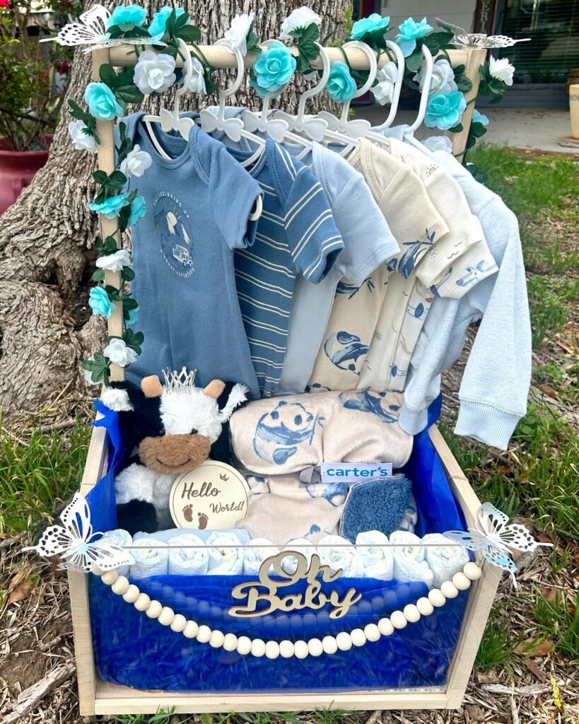 This impressive display uses a white wooden crate and a mini clothes rack to create a stunning presentation focused on the color blue. It features a stack of blue baby clothes, essentials, bottles, and is dramatically accented by a cluster of pale blue balloons tied with baby’s breath.