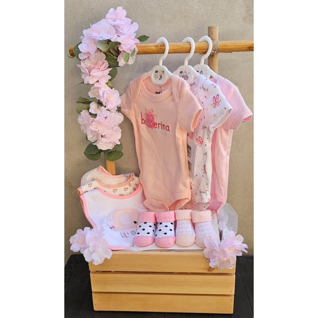 A lovely wooden crate supports a small clothes rack featuring sweet ballerina and butterfly-themed pink onesies. The base is filled with a coordinating bib, patterned socks, and is heavily decorated with gorgeous clusters of pink hydrangea-style silk flowers.