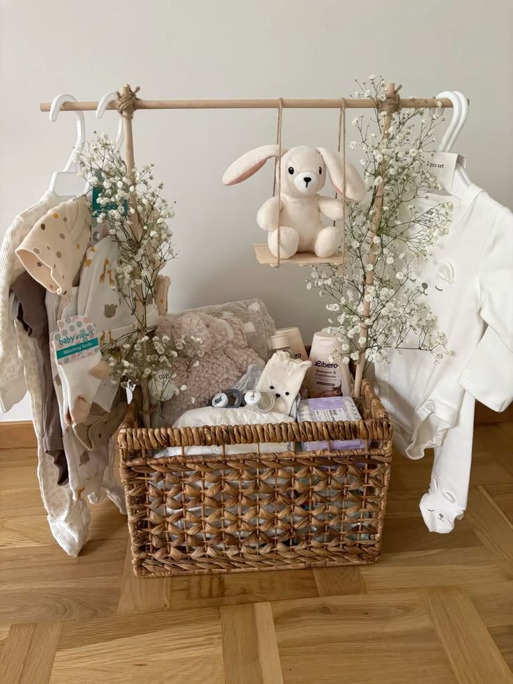 This delightful, gender-neutral basket utilizes a natural woven rectangle and features a playful setup where a soft stuffed bunny is suspended from the clothes rail on a tiny swing. The rail holds white and light beige patterned onesies, and the whole arrangement is flanked by vertical bouquets of baby’s breath.