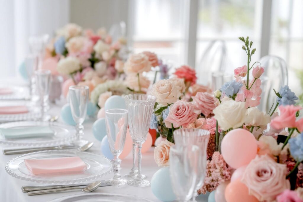 This show-stopping look features a long, lush arrangement of light pink, blush, and soft blue flowers, creating a continuous runner down the center of the table. Small pastel-colored balloons are nestled directly into the flowers, adding a playful, dimensional element that beautifully ties the whole scene together.