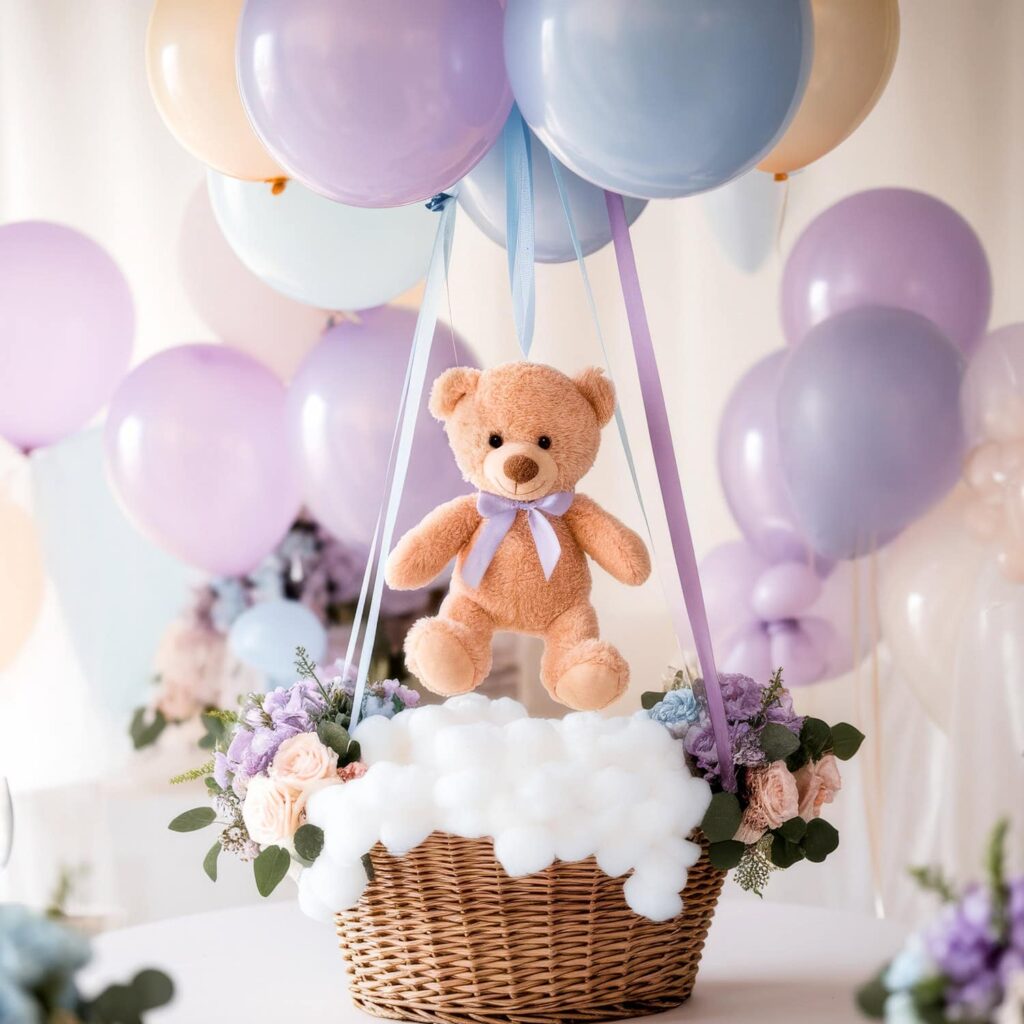 This charming centerpiece features a plush teddy bear suspended above a rustic wicker basket filled with soft, pastel-colored florals and fluffy white batting that mimics a cloud. Ribbons in soft blues and purples connect the bear to a cluster of matching balloons, simulating a hot air balloon floating gently toward the sky.