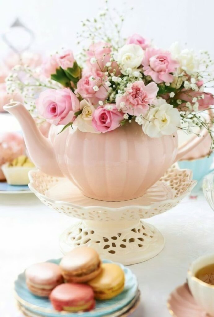 A delicate pink teapot serves as a wonderfully unconventional vase, overflowing with a gentle mix of pink roses, white carnations, and airy baby’s breath. The teapot rests upon a tiered white cake stand with a pretty lace cutout pattern, elevating the arrangement and making it a feature on the table.