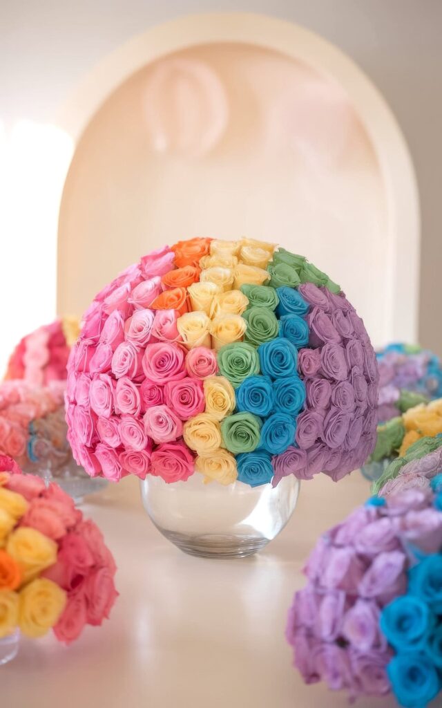 The design is effective because of its high visual impact and bold use of color blocking, instantly commanding attention and celebrating the anticipation of the new arrival. It generates a mood of high energy, happiness, and cheerful celebration, promising a bright future. If you’re using real roses, ask your florist about color-dyed options to achieve this striking, uniform vibrancy in the full rainbow spectrum.