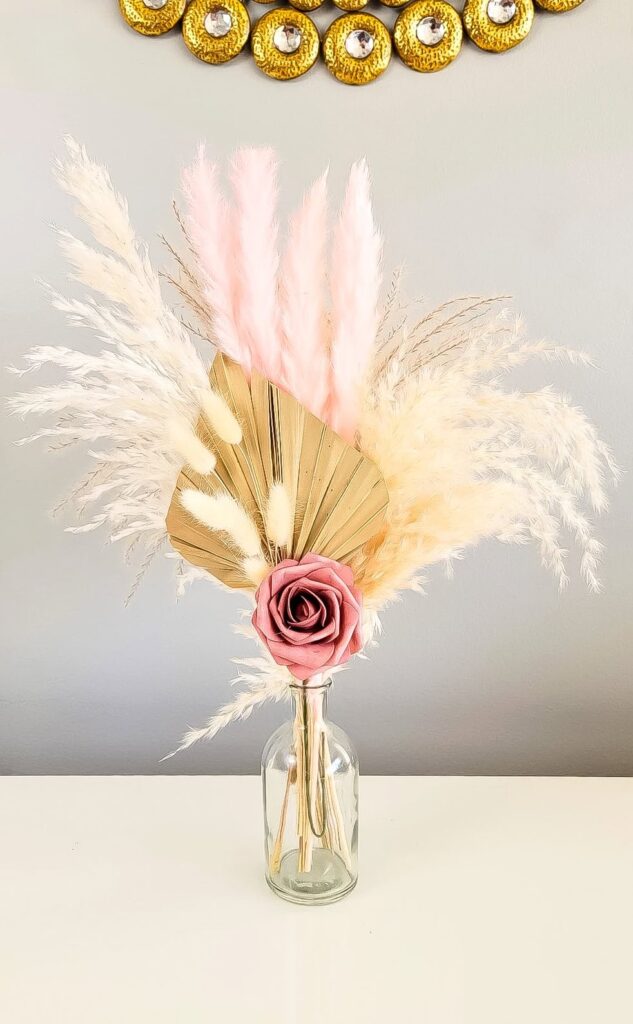 The visual appeal comes from the contrast between the soft, diffused texture of the pampas and the sharp, metallic lines of the fan, giving it a sophisticated edge. This arrangement creates a mood that is effortlessly stylish, grounded, and subtly feminine. To achieve the perfect boho vibe, source natural elements like dried ferns or bunny tail grasses to mix with the pampas.