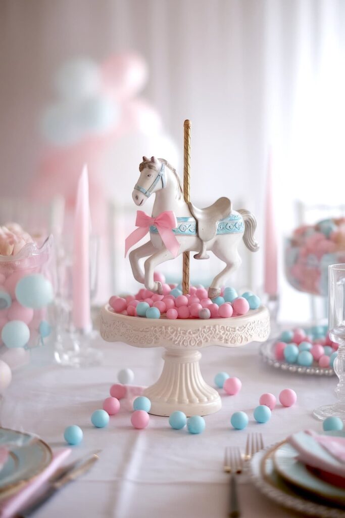 A miniature white and gold carousel horse, adorned with a sweet pink bow, stands proudly atop an elegant white cake pedestal. The base is scattered with pink and light blue candy balls, adding a touch of childlike delight and complementary color to the scene.