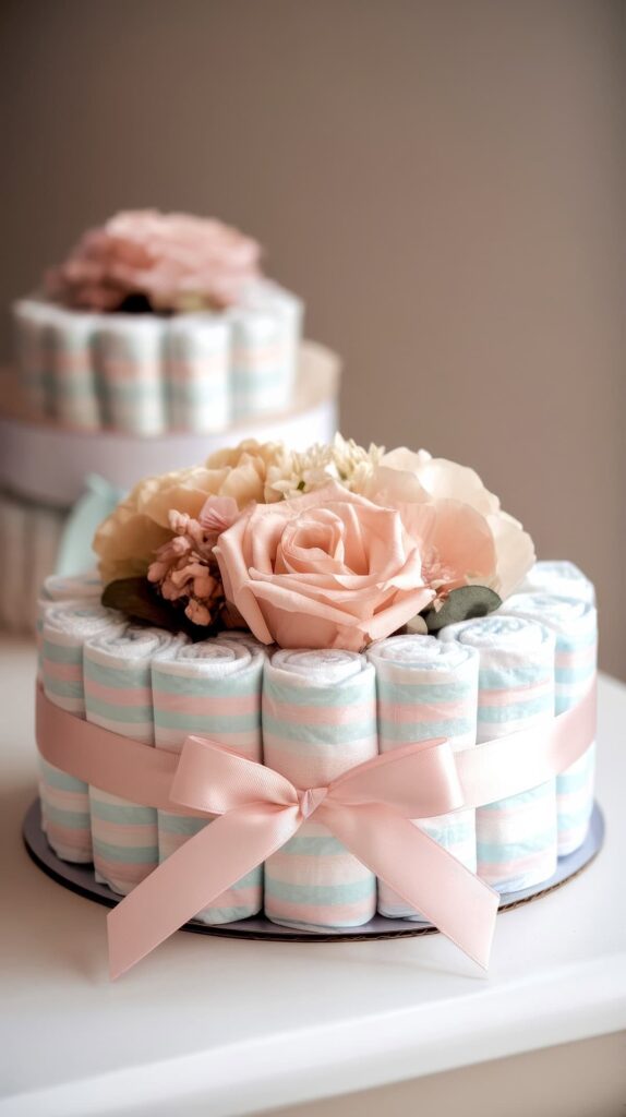 This practical yet pretty centerpiece is designed as a small, tiered diaper cake, wrapped in light blue and pink striped diapers and tied beautifully with a wide pink satin ribbon. The top is crowned with a cluster of silk roses and faux blossoms in coordinating soft peach and pink tones. Its genius lies in its dual function: it’s beautiful table decor and a useful gift for the parents-to-be, celebrating motherhood in a lovely way.