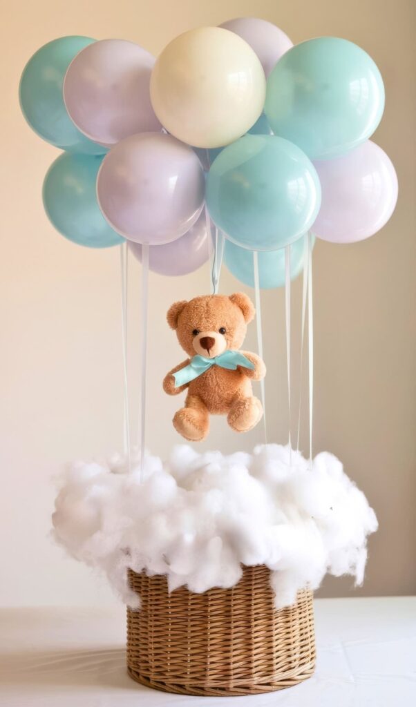 This whimsical element creates a very soft, serene, and imaginative mood, reminiscent of a sweet lullaby. Make sure to use helium-filled balloons and secure the ribbons carefully to ensure the bear appears to be floating gracefully above the table.
