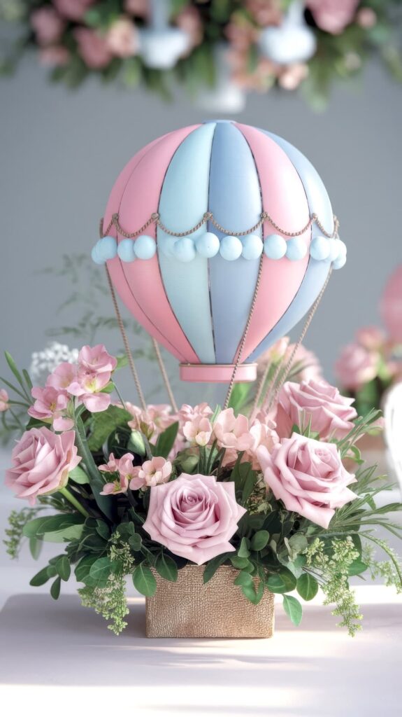 A charming, handcrafted hot air balloon model dominates this piece, featuring wide pink and blue panels and a tiny basket detailed with bobbles and chains. It is anchored in a lush arrangement of pink roses and greenery that sits inside a textured gold container. The contrast between the whimsical, structured balloon and the organic, romantic florals makes for a stunning composition.