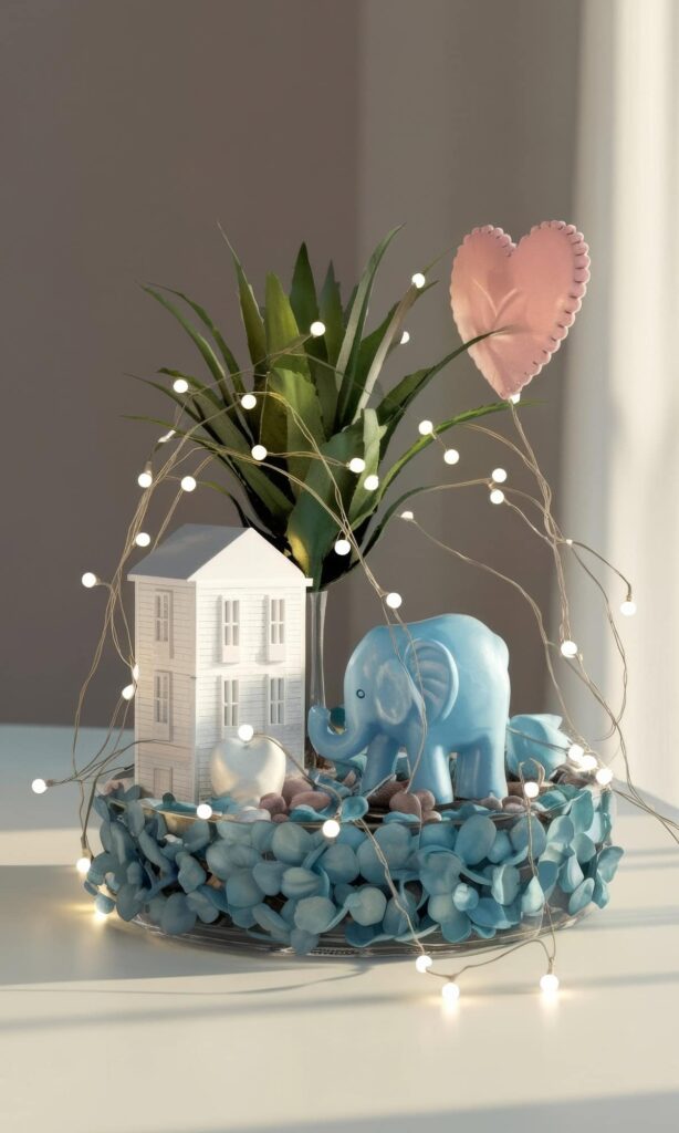 This adorable arrangement features a small blue elephant figurine and a miniature white house nestled among leafy green plants and small, smooth river stones. The entire scene is draped in delicate fairy lights, lending a soft, magical glow. The clear plate base is surrounded by blue floral embellishments, adding extra texture.
