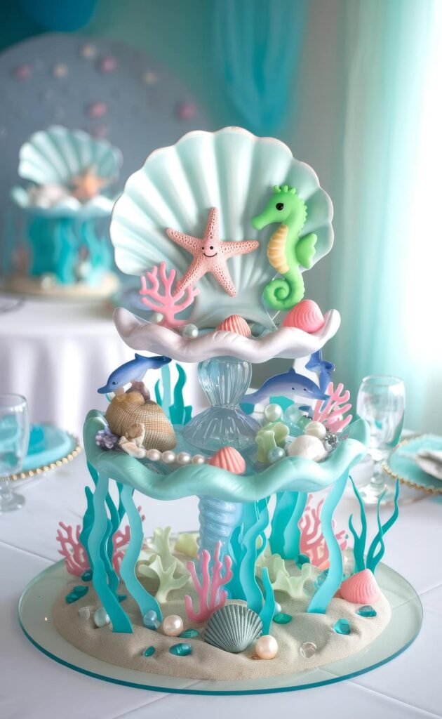 A vibrant, playful two-tiered centerpiece captures the magic of an underwater world, featuring sculpted creatures like a seahorse and starfish, shells, and delicate pink and blue seaweed cutouts. The base is textured to look like sand, sprinkled with faux pearls. The visual success comes from the intense, cheerful color palette and the tiered structure, which elevates the different elements like a tiny cake stand.