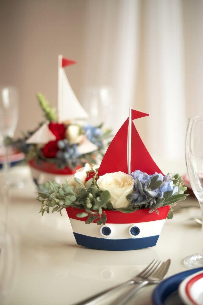 This centerpiece creates a spirited, breezy, and traditionally themed mood, ideal for a “Little Sailor” shower. To replicate this, use waterproof liners inside the paper boat containers to keep the fresh flowers hydrated without damaging the decor element.