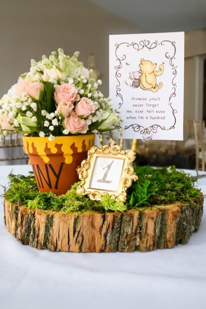 It balances the cute, nostalgic element of Winnie the Pooh with earthy, natural textures. This display evokes a sense of cozy charm, genuine warmth, and pastoral simplicity. Try using a clear varnish over the wood slice to protect it and bring out the beautiful natural grain of the material.