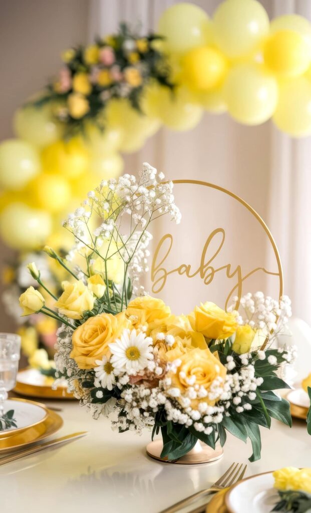A sunny, celebratory centerpiece featuring bright yellow roses, white daisies, and airy baby’s breath, arranged beautifully inside a golden circular hoop base. A delicate script word “baby” is inscribed within the circle, adding a personalized, joyful touch.