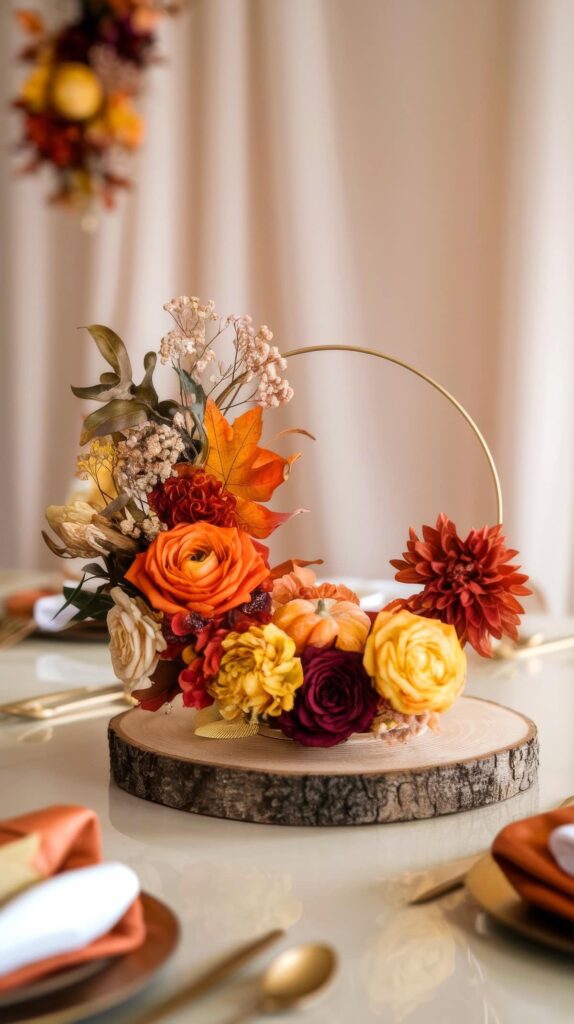This stunning piece celebrates an autumn arrival, built on a wood slice base with a gold circular frame holding rich, warm-toned florals. Deep reds, oranges, yellows, and rustic greenery, along with miniature gourds and silk leaves, create a rich tapestry of color.