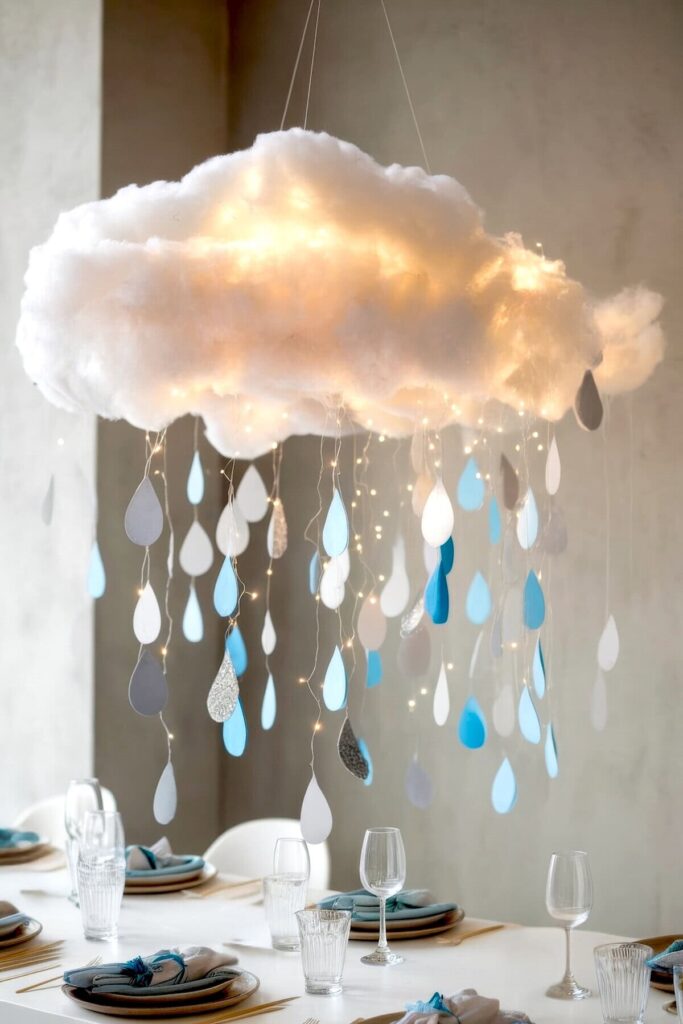 A whimsical, hanging centerpiece that uses fluffy cotton batting wrapped around a string of fairy lights to create a glowing cloud. Dangling underneath are paper cutouts of raindrops in various shades of blue, gray, and sparkling silver.