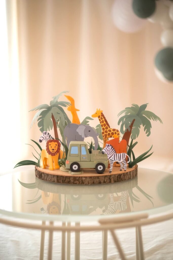A playful safari scene is created on a wood slice base, featuring cheerful, brightly colored wooden cutouts of jungle animals like a lion, zebra, elephant, and giraffe. Tropical palm fronds and a tiny jeep complete the adventurous look.