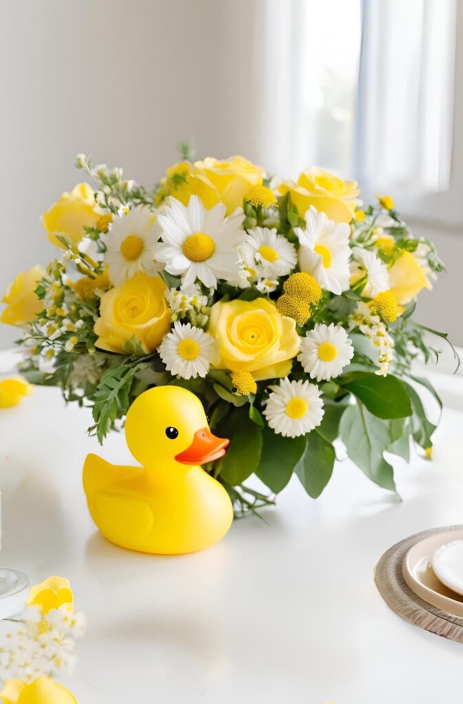 The combination of the refined floral arrangement with the playful toy creates a perfect balance of elegance and childlike fun. The energy here is undeniably happy, fresh, and pure. To make the ducky theme subtle yet cohesive, add tiny hints of yellow to the place settings, such as a lemon yellow napkin or a small tie on the cutlery.