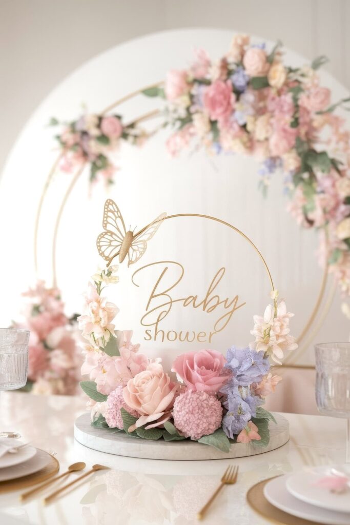 A delicate gold hoop frames the script words “Baby Shower” and is lavishly adorned with a romantic grouping of faux flowers in pastel pinks, lavenders, and blues. A metallic gold butterfly accent sits on the top of the hoop, adding an element of light fantasy.