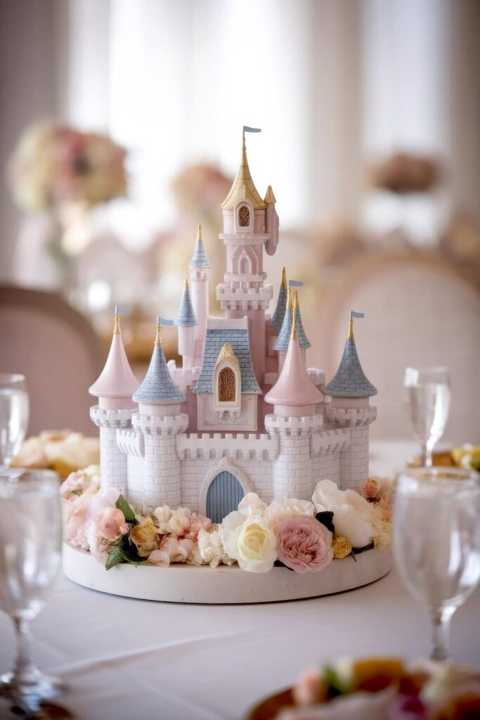 A magnificent miniature castle in soft pink, white, and pale blue is the centerpiece, complete with tiny turrets and flags, reminiscent of a princess’s abode. It sits on a round base encircled by a charming garland of soft pink and cream roses. The intricate detail of the castle structure makes this a true statement piece, perfect for celebrating a little girl.