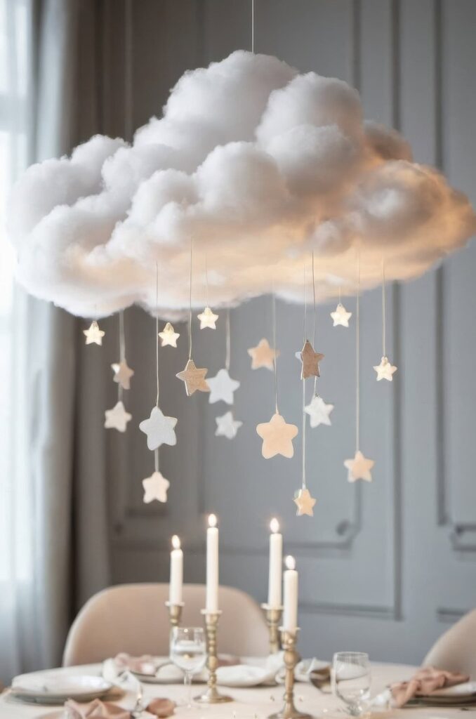 The soft, diffused glow and hanging stars create an incredibly peaceful, dreamy, and celestial mood, like a little piece of the night sky brought indoors. Place simple pillar candles on the table beneath it to highlight the soft light filtering down from the cloud.