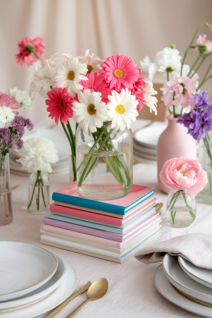 A stack of colorful notebooks or books in gentle pastel shades of pink, blue, lavender, and white provides a vibrant platform for a clear vase of fresh, cheerful flowers. The bouquet includes bright pink gerbera daisies and white daisies for a pop of color.