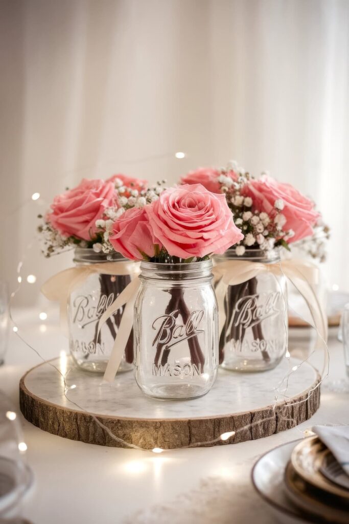 A timeless trio of Ball Mason jars, each tied with a simple cream ribbon, holds a cluster of delicate pink roses and baby’s breath. They sit on a marble-topped, round wood slice and are surrounded by sparkling string lights.