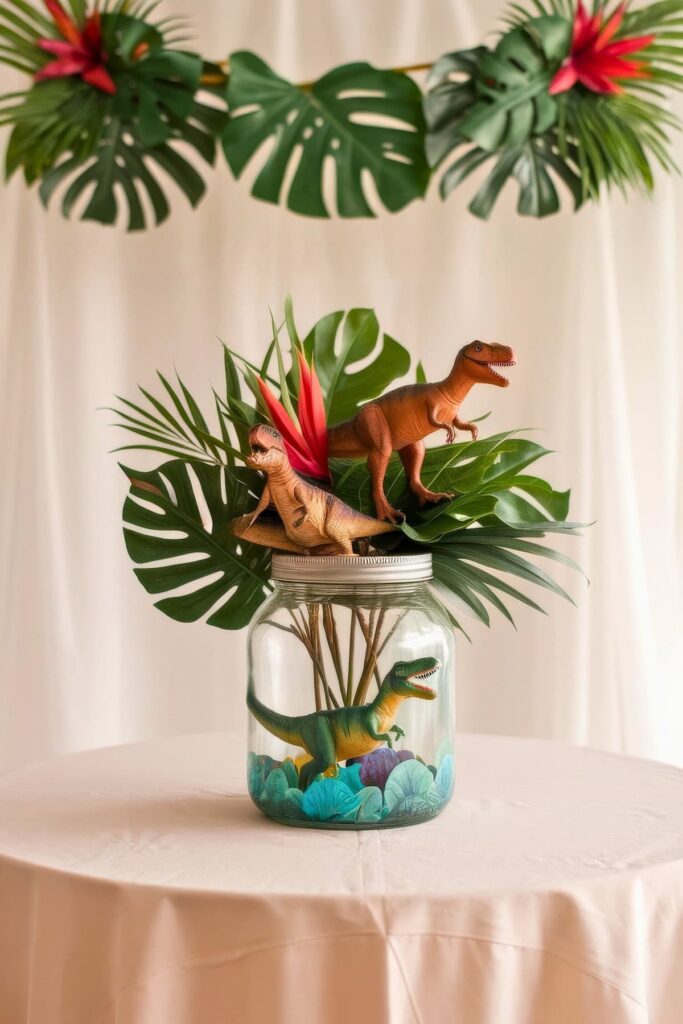 This unexpected and fun centerpiece features toy dinosaurs arranged in a tropical setting, with some inside a glass mason jar that’s decorated to look like water and others perched on lush palm fronds on top. The bold green leaves create a striking, wild backdrop. This is a brilliant example of how to execute a unique, non-traditional theme with high visual drama.