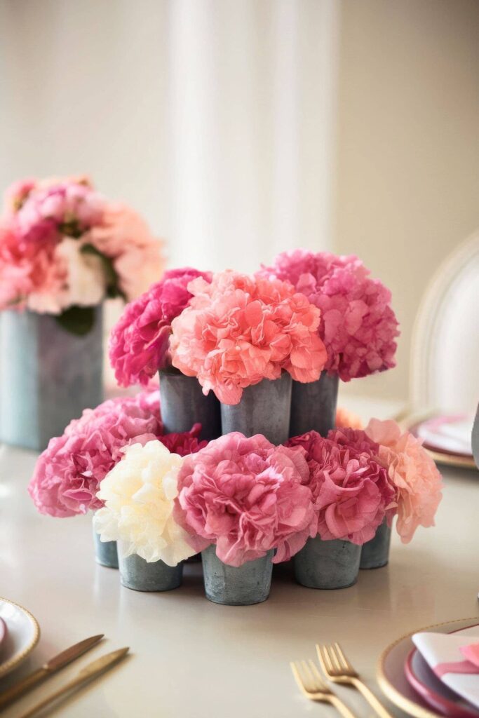 A delightful arrangement of faux flowers, crafted from vibrant pink and coral tissue paper, is clustered tightly together in small, simple gray pots. The grouping of multiple small arrangements into one large, textural centerpiece gives a DIY, homemade touch. This piece works because the varied pink hues and layered tissue create intense texture and volume, giving the illusion of a massive, fluffy bouquet.
