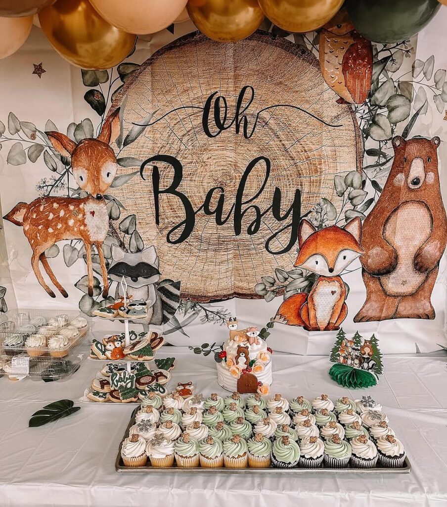 This enchanting display features a variety of woodland-themed treats including detailed cookies shaped like foxes, bears, and raccoons. The table is anchored by a “Oh Baby” wood-grain backdrop surrounded by adorable animal cutouts and sage green cupcakes. This design works because it uses a cohesive color palette of browns and greens to bring the forest theme to life. The variety of heights on the cookie stands adds visual interest and makes the treats look even more inviting. The energy is incredibly sweet and whimsical, perfectly capturing the magic of a forest adventure. Guests will feel a sense of wonder as they choose a handcrafted cookie to take home. A simple tip is to use a large themed backdrop to instantly define your gift or treat area.