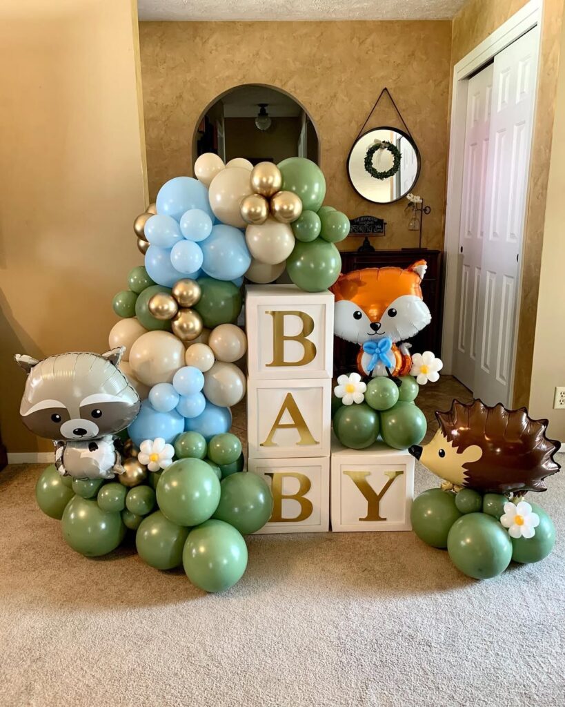This indoor arrangement features a stack of white and gold “BABY” blocks surrounded by colorful balloon clusters. Foil balloons of a raccoon, fox, and hedgehog add a whimsical, character-driven touch to the floor display. The design works visually because it uses the floor space effectively to create a large impact without needing a wall. The mix of light blue and sage green gives a gentle nod to a “baby boy” theme. The mood is very cheerful and lighthearted, perfect for a family-focused celebration. It feels approachable and fun for guests of all ages. Placing character balloons at eye level for children is a sweet way to include them in the decor.