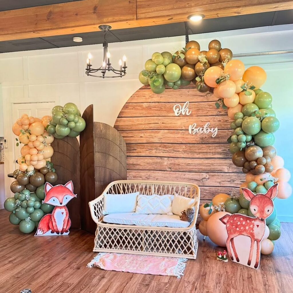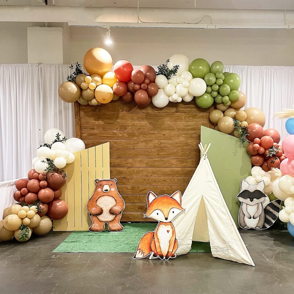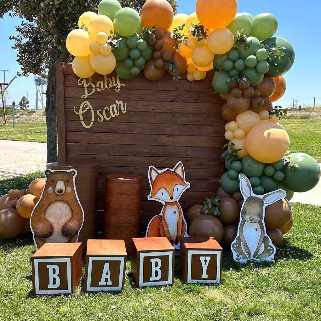 This outdoor setup features a bold wooden plank backdrop adorned with a lush balloon garland in shades of ochre, sage, and brown. Large character cutouts of a bear, fox, and bunny sit at the base alongside oversized “BABY” blocks. The design is successful because the natural wood texture balances the playful, modern look of the balloon clusters. Using different sizes of balloons creates a professional, organic feel that mimics clouds or foliage. The mood is bright, sunny, and celebratory, making it a perfect spot for photos. It creates a high-energy focal point that draws guests in immediately. You can recreate this by mixing matte balloons with a few shiny ones for added depth.