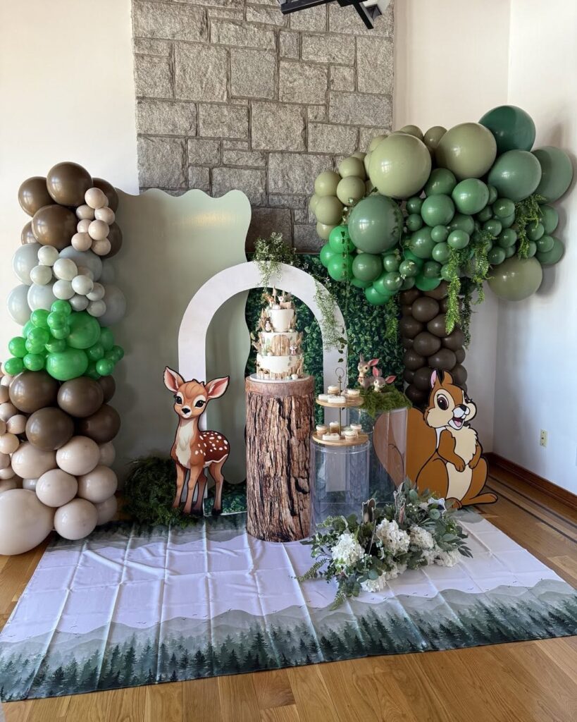 This display features a stunning white arch framing a multi-tiered cake that looks like a forest tree. A massive balloon “tree” made of brown and green balloons stands to the side, complete with a large squirrel cutout. The visual design is incredible because it uses balloons to create 3D structures like the tree. The “forest floor” rug helps ground the display and provides a cohesive base. The mood is very magical and almost like a movie set, sparking lots of conversation. It feels very creative and high-effort. You can create a “balloon tree” by using a tall pole as a base and attaching balloons in a tapering shape.