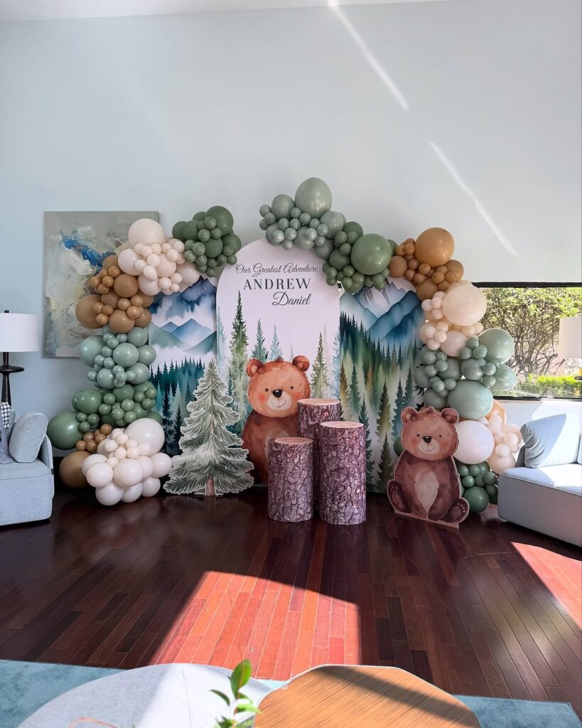 This wall display features an arched sign with mountain illustrations and the phrase “Our Greatest Adventure”. It is surrounded by a voluminous balloon garland in sage, cream, and brown, with bear cutouts and “log” pillars. The design is visually successful because the mountain imagery on the backdrop adds a sense of scale and distance. The “log” pillars are a clever way to display small gifts or treats at different heights. The energy is very adventurous and heartwarming, focusing on the journey of parenthood. It feels modern, clean, and very on-trend for nursery decor. You can easily print a custom backdrop like this to give your party a high-end, personalized feel.