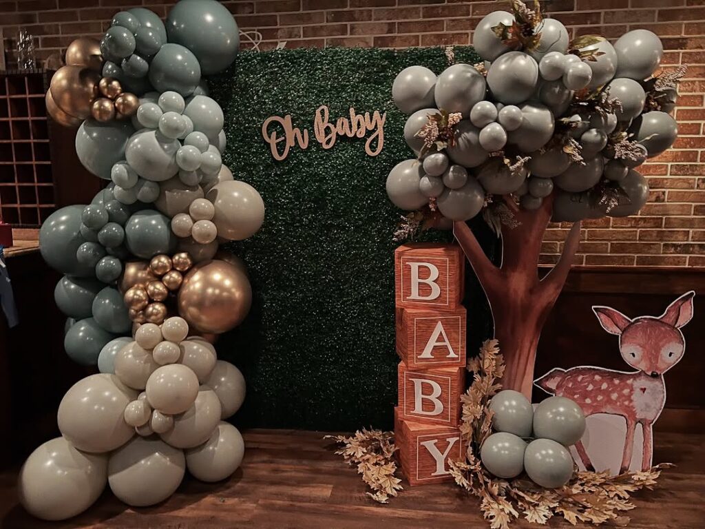 This setup uses a lush green hedge wall as a backdrop for a wooden “Oh Baby” sign and a stack of wooden blocks. A balloon garland and a balloon-topped tree stand alongside a sweet deer cutout on a bed of autumn leaves. The design works because the green hedge provides a perfect natural texture that makes the wood and balloons stand out. The addition of real dried leaves on the floor adds an extra layer of sensory detail. The feeling is very seasonal and warm, like a crisp day in the woods. It feels very thoughtful and well-themed. A faux-hedge wall is a versatile backdrop that you can reuse for many different party themes.