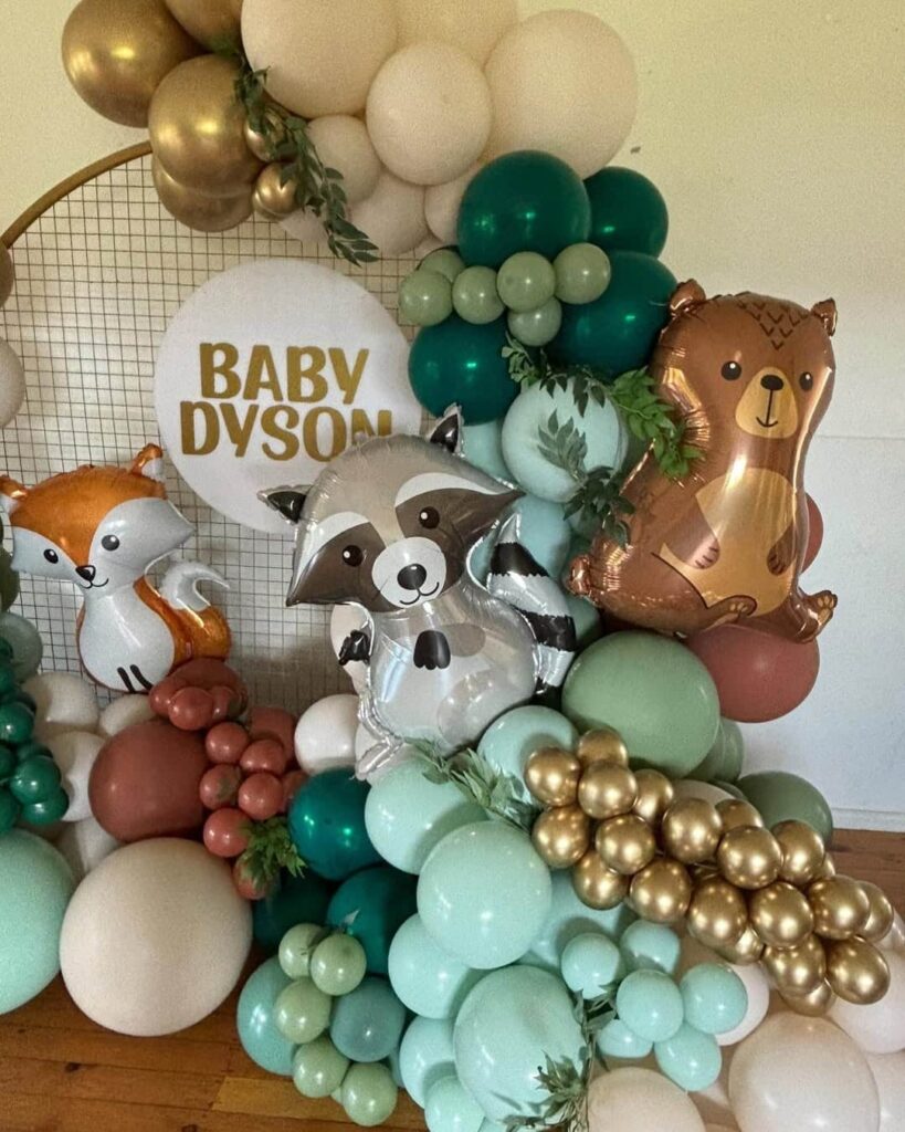 This indoor display focuses on a large wire mesh hoop decorated with a dense arrangement of balloons in teal, cream, and metallic gold. Fun animal-shaped foil balloons like a raccoon and a bear are tucked into the arrangement for a playful touch. The design works visually because the metallic gold balloons provide a pop of elegance against the earthy tones. The mesh backdrop allows you to easily clip on signs or additional greenery. The feeling here is very cozy and intimate, like a secret corner of a magical forest. It feels both sophisticated and kid-friendly at the same time. Try using a hoop stand if you have a smaller space but still want a big impact.