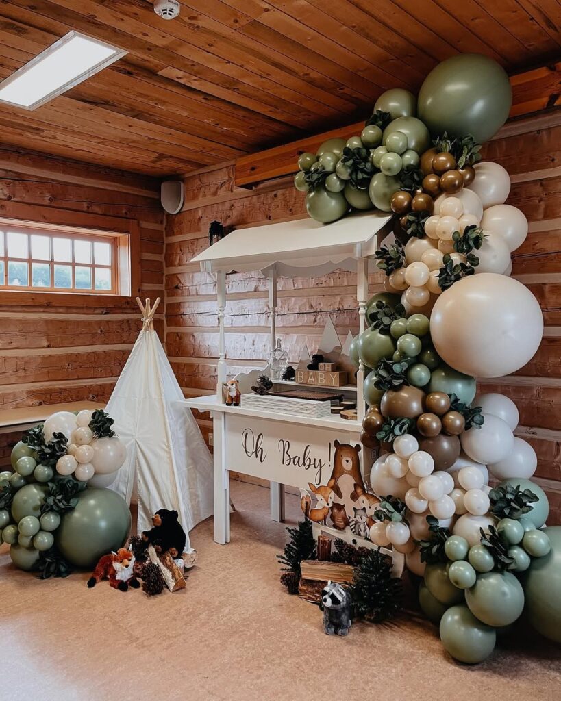 This creative display uses a white wooden candy cart nestled inside a log cabin-style room. A dramatic sage and tan balloon garland spills over the cart, which is decorated with pinecones and small animal plushies. The design is successful because the cart provides a dedicated, organized space for guest favors. The natural wood walls of the room enhance the forest theme perfectly. The energy is very cozy and rustic, feeling like a weekend getaway in the mountains. It makes the act of picking up a gift feel like visiting a charming forest shop. If you don’t have a cart, a simple white table with a canopy can achieve a similar look.