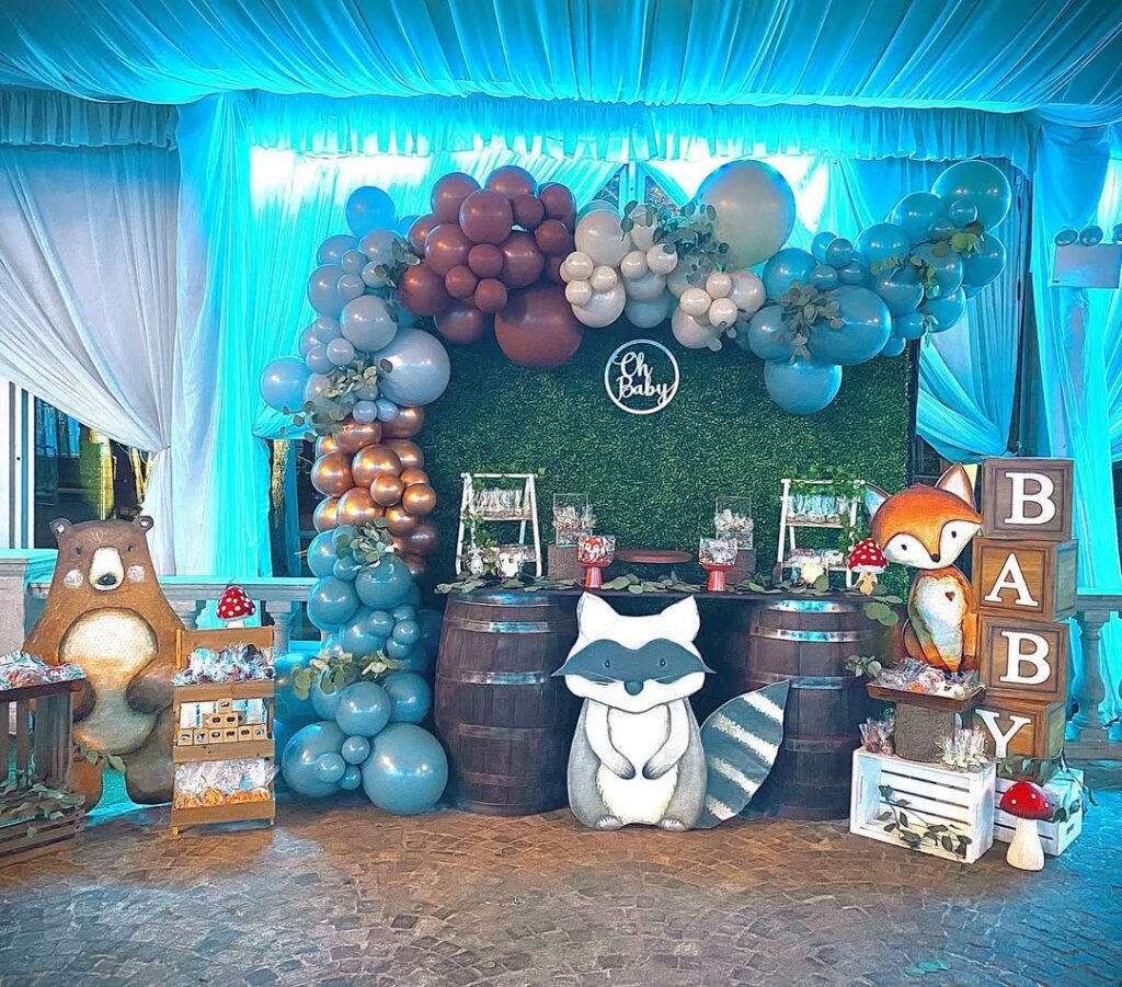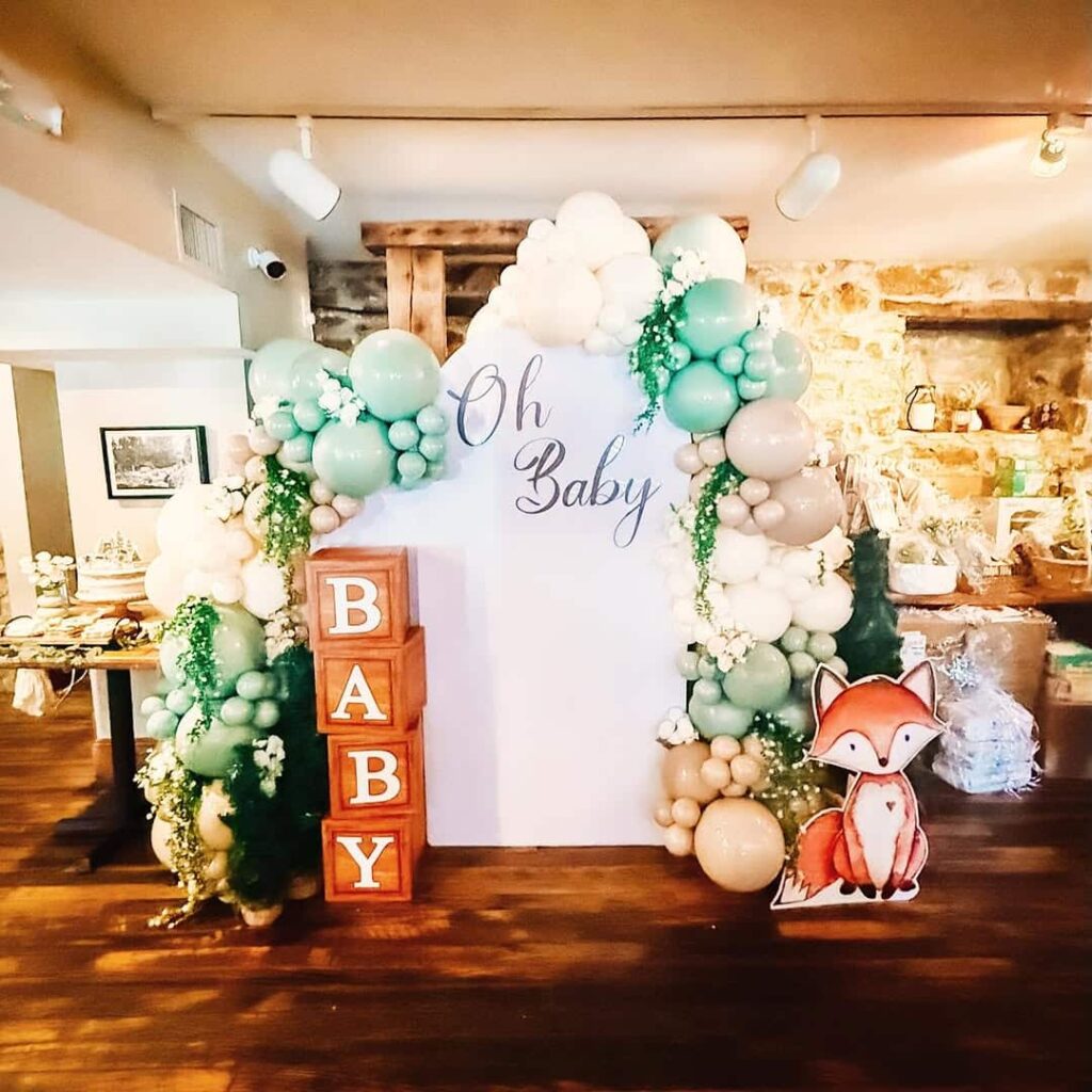 This elegant setup uses a crisp white arch as a backdrop for a script “Oh Baby” sign and a mint green balloon garland. Large wooden “BABY” blocks are stacked on the side, and a fox cutout sits at the base. The visual design is effective because the white arch makes the mint green and tan balloons really pop. The vertical height of the blocks helps balance the roundness of the balloon arch. The energy is very clean, bright, and modern, offering a fresh take on the woodland theme. It feels celebratory and very “Instagrammable”. Using white as your base color helps keep the theme feeling airy and light.