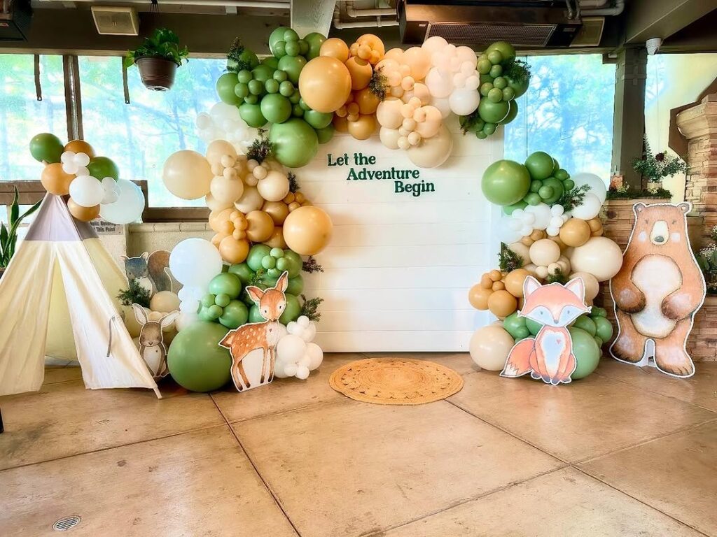 This rustic scene features a sage green backdrop with the words “Adventure Awaits” and pillars that look like tree trunks. Balloon garlands in deep green, black, and tan frame the wooden fireplace area. The visual success comes from the use of realistic textures like the “bark” on the pillars and the brickwork. The darker balloon colors add a sophisticated, moody forest vibe that is very unique. The mood is slightly mysterious and very cozy, perfect for a fall or winter baby shower. It feels very substantial and grounded. Using tree trunk wraps on simple cylinders is an easy way to get this high-end look.