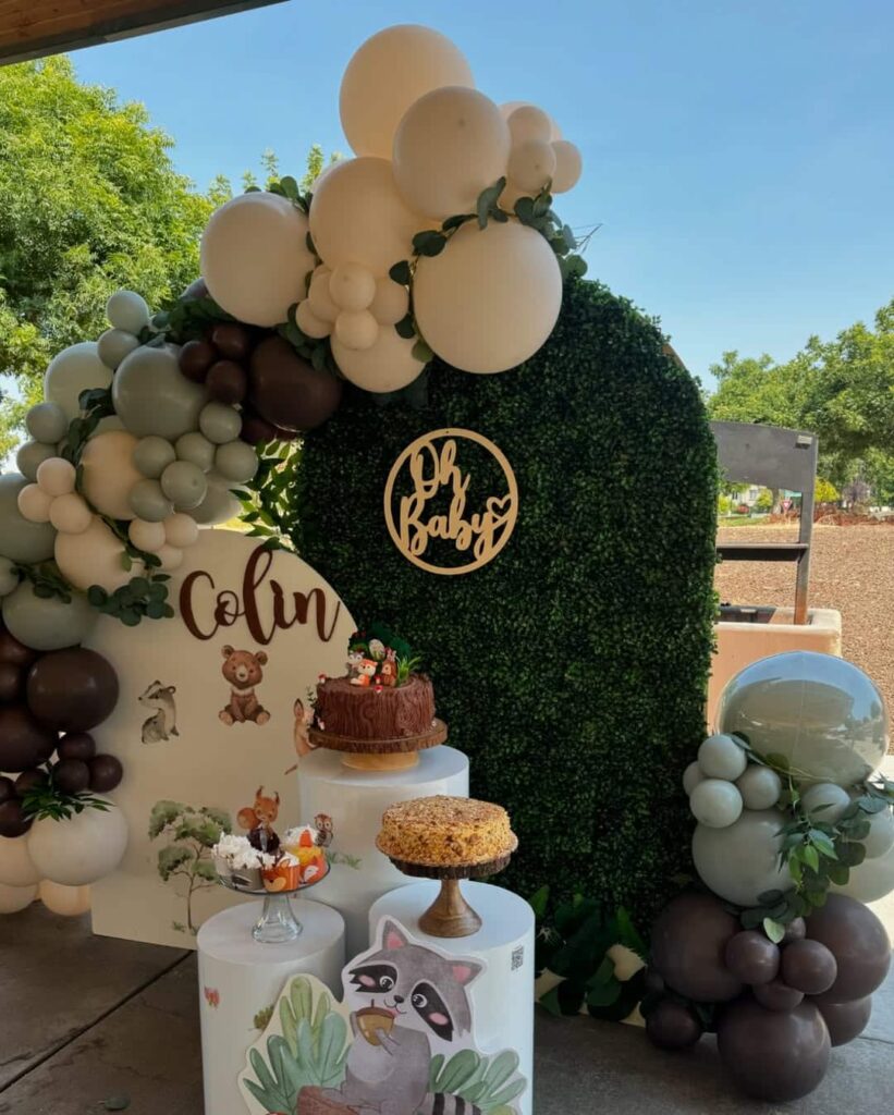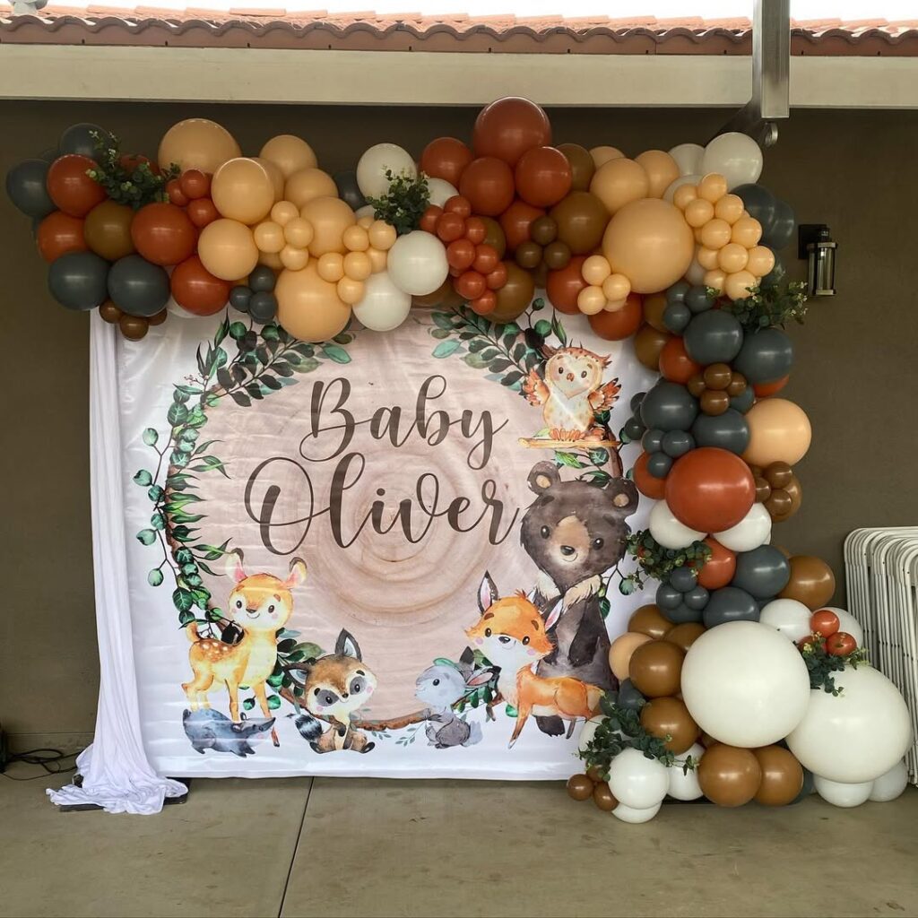This idea uses a large printed fabric backdrop featuring a variety of forest animals inside a wooden wreath. The backdrop is framed by a voluminous balloon garland in charcoal, burnt orange, and tan. Visually, the design is effective because the colors in the balloons perfectly pull from the illustrations on the backdrop. The symmetry of the balloons framing the name “Baby Oliver” makes the personalization stand out. The feeling is very warm and welcoming, centered entirely around the new arrival. It feels like a giant, colorful hug for the guests. A printed backdrop is one of the easiest ways to set a theme without needing many small props.