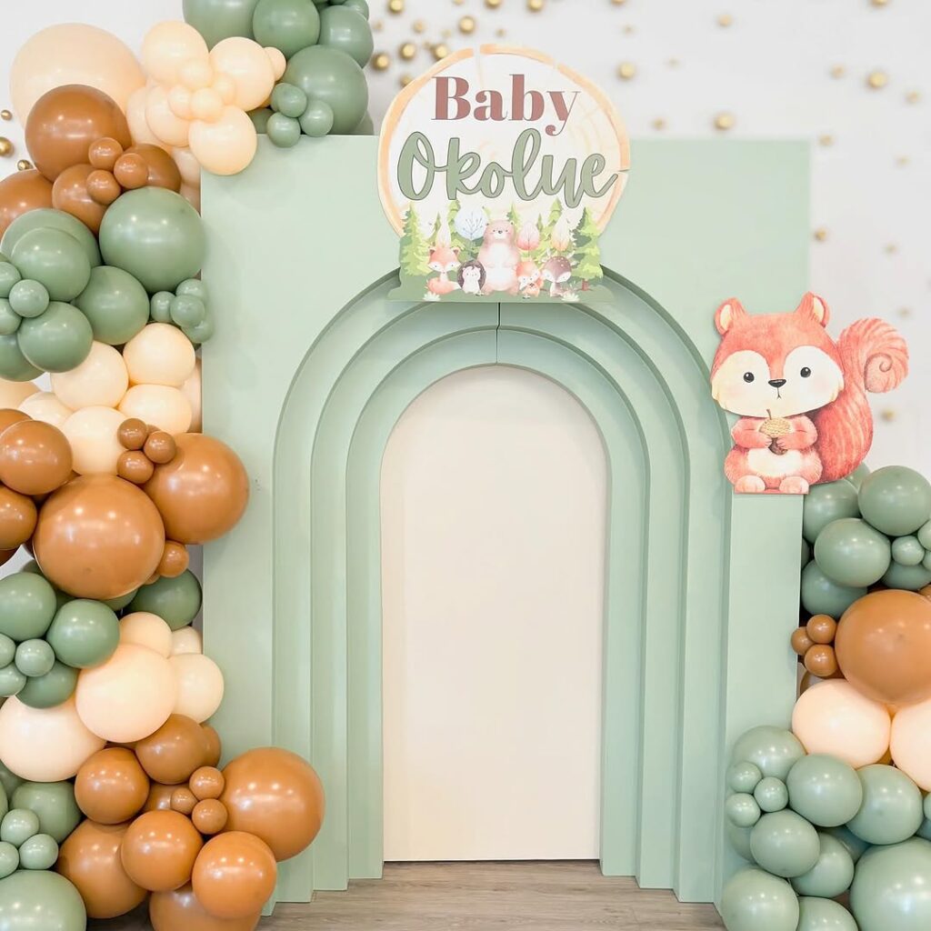 This minimalist and modern design features a sage green arched backdrop with a cute squirrel cutout. Organic balloon clusters in tan and sage green frame the arch, which is topped with a personalized “Baby Okolue” sign. The visual success lies in the clean lines and the trendy “arched” aesthetic that is popular in current home decor. The simple color palette feels very “Boho” and calm. The mood is gentle and peaceful, reflecting a quiet moment in nature. It feels very high-end and curated. You can create a similar look with a large piece of foam board cut into an arch and painted your favorite nursery color.