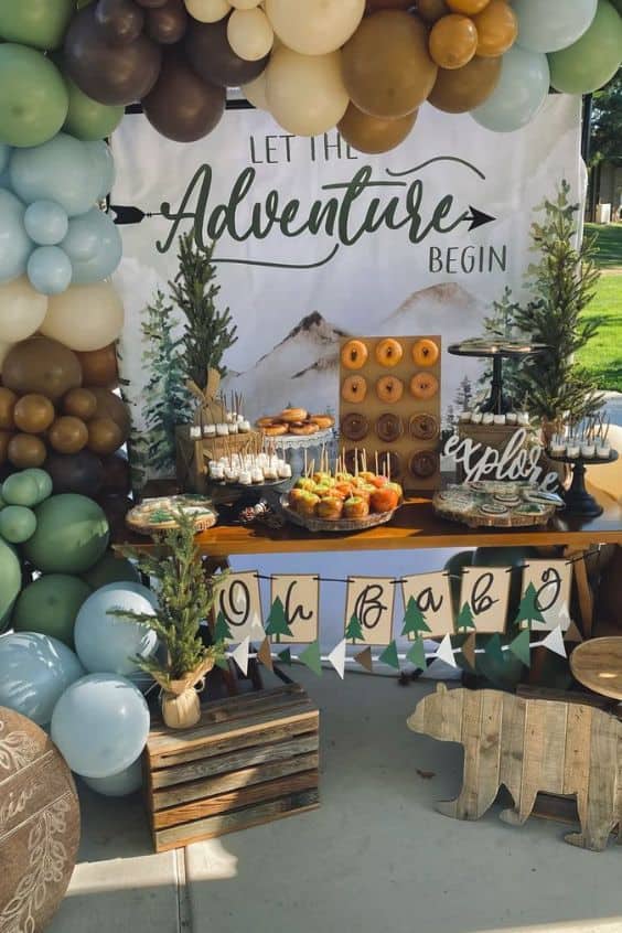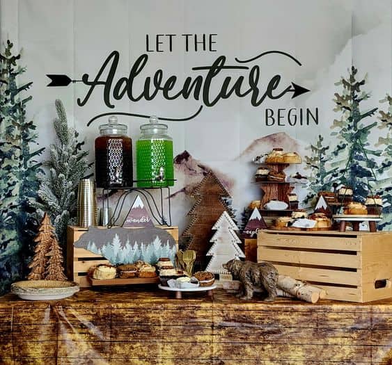 The thematic consistency from the “Let the Adventure Begin” banner down to the bear-shaped snacks is impressive. Using crates to create different heights makes the buffet look abundant and organized.
