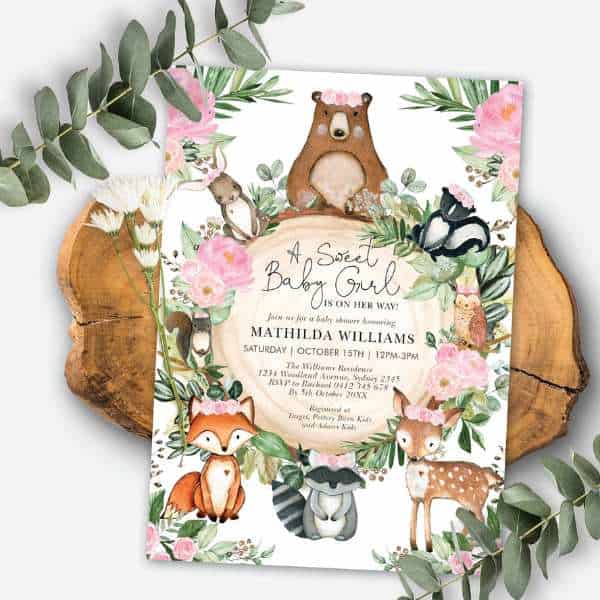 This darling invitation features a watercolor collection of forest friends, including a bear, fox, deer, and raccoon, all wearing soft pink flower crowns. The central text is framed by a rustic wood slice graphic and delicate eucalyptus sprigs.