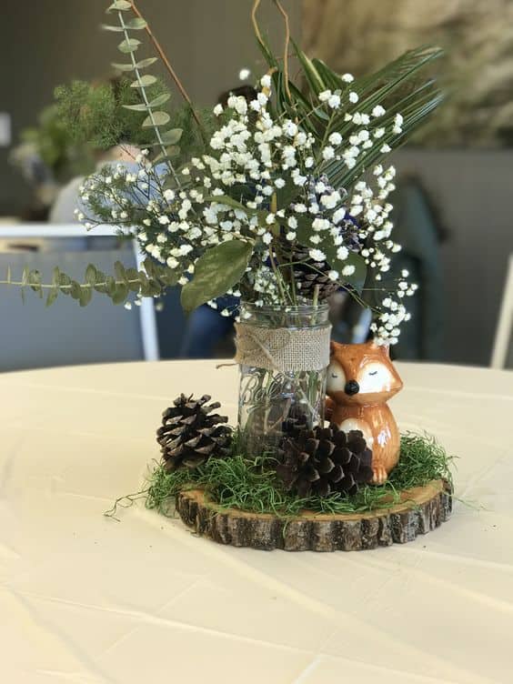 A simple glass mason jar wrapped in burlap and twine holds a delicate arrangement of baby’s breath and greenery. This sits on a thick natural wood slice, surrounded by a bed of green moss and scattered pinecones, with a tiny ceramic sleeping fox tucked in.